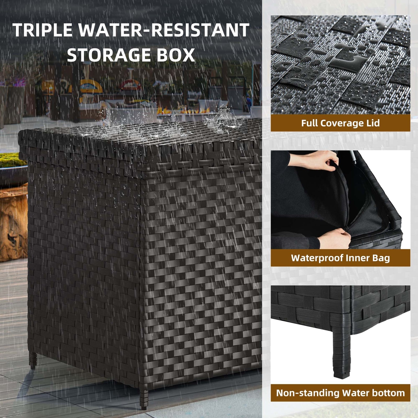 Material: PE Rattan+Steel. 120 Gallon Deck Box. 165 Gallon Deck Box. 170 Gallon Deck Box. 70 GAL Deck Box w/ Seat. Capacity: 230 gallons. Storage Type: Deck Box. 1 x Outdoor Storage Box + Inner Bag.