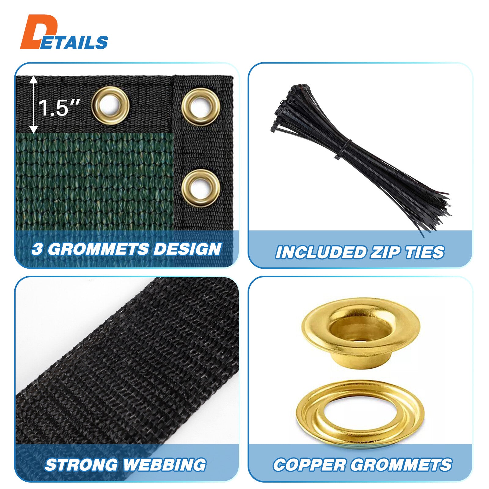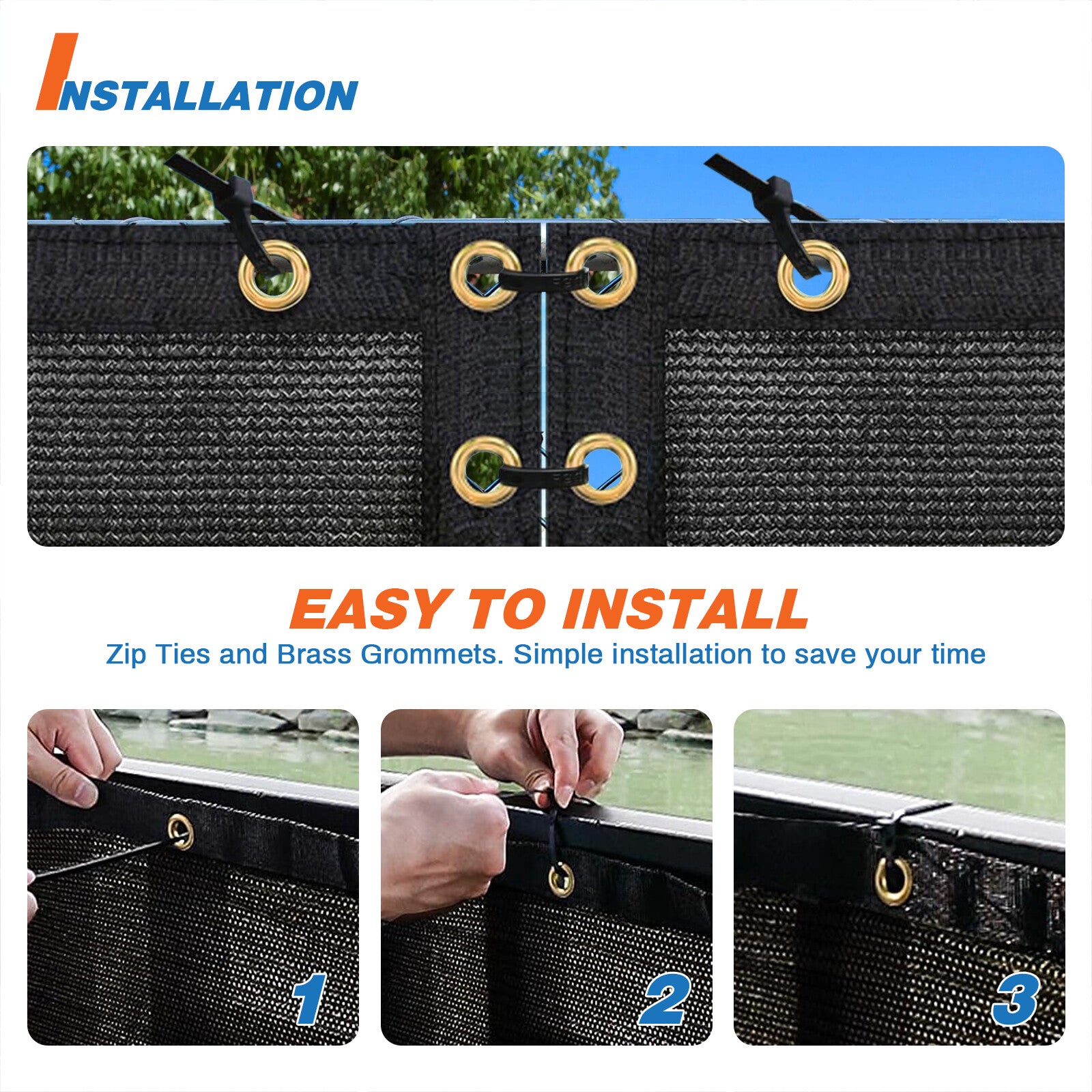 - Our 150GSM (Grams per Square Meter) Privacy Fence Screen have rustproof grommets placed every 12'' vertically and 18''- 24'' horizontally on all 4 sides with 3 extra grommets on each corners. All edges are wrapped and finished with 1.5" wide black heavy duty binding tape to prevent edges from unraveling, and stabilize the grommets. (Note: Privacy Fence Screens is not design to use as a shades to be hanging over the top. If Sun Shade Sail are preferred check out our Straight Edges Shade Sail with Grommets)