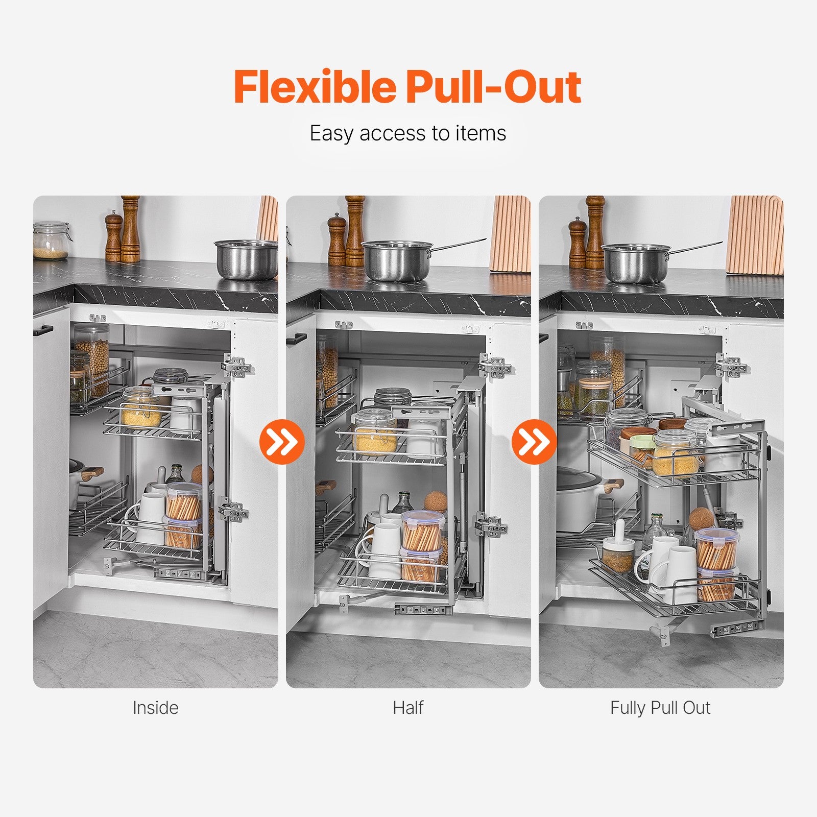 Blind Corner Pull Out Organizer. Compatible with Left or Right Opening Doors: A standout feature of this storage organizer rack is its support for installation in both left-opening and right-opening blind corner cabinets.