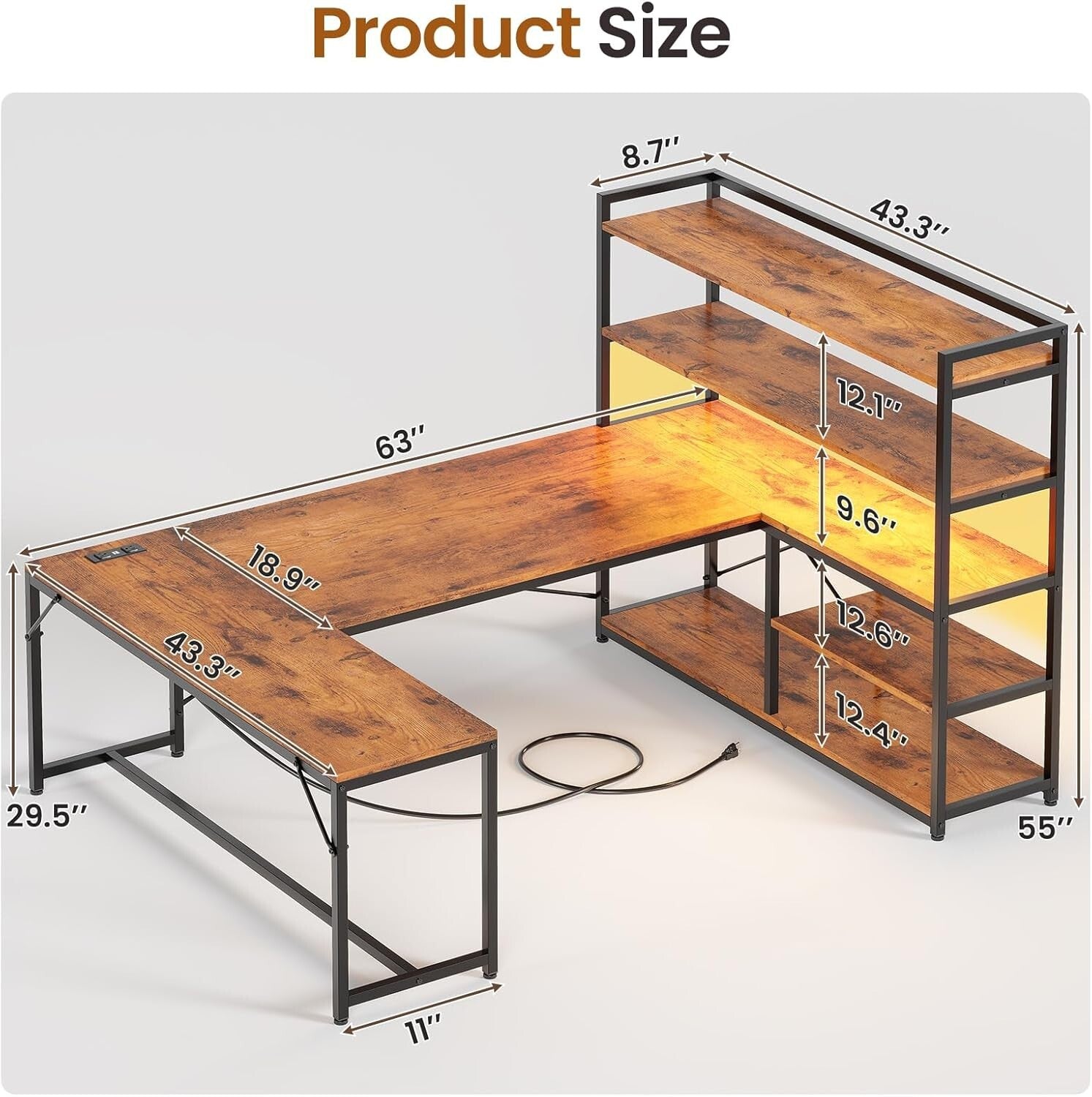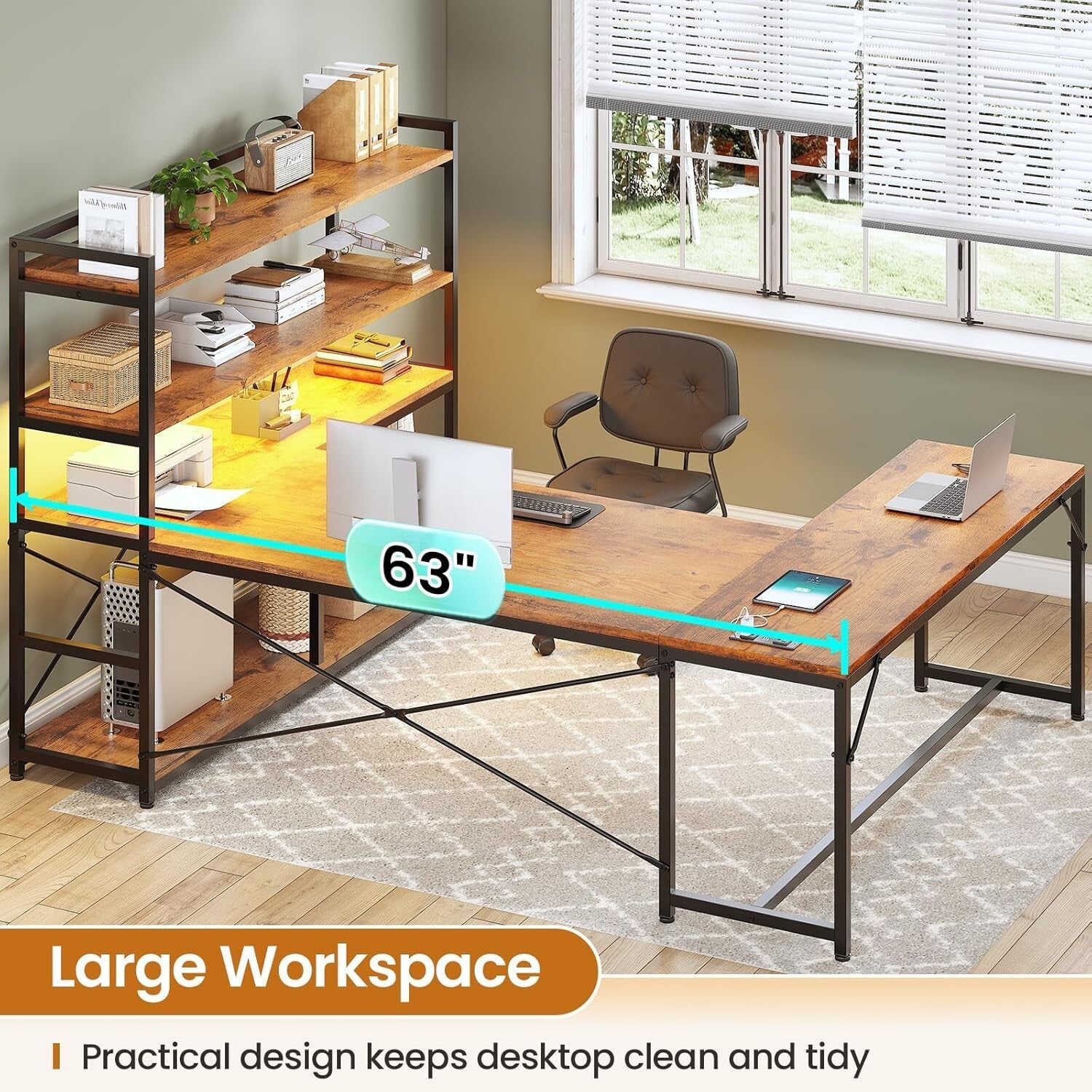 【L Shaped Desk】, 【Ample Storage Space】, 【Reversible Design】, 【 Charging Port】, 【Cool & Smart Led Light】