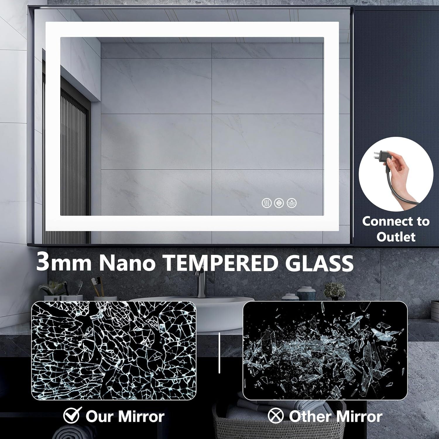 【Premium Quality Nano Tempered Glass】: The wall LED mirror is made of high quality 3mm nano-tempered glass, which is shatter-proof, explosion-proof, clear reflection without distortion, and designed to be long-lasting and safe.