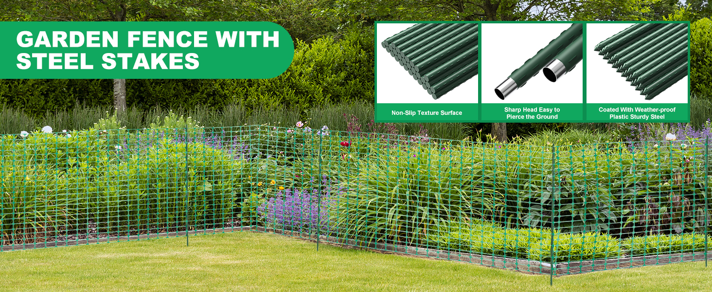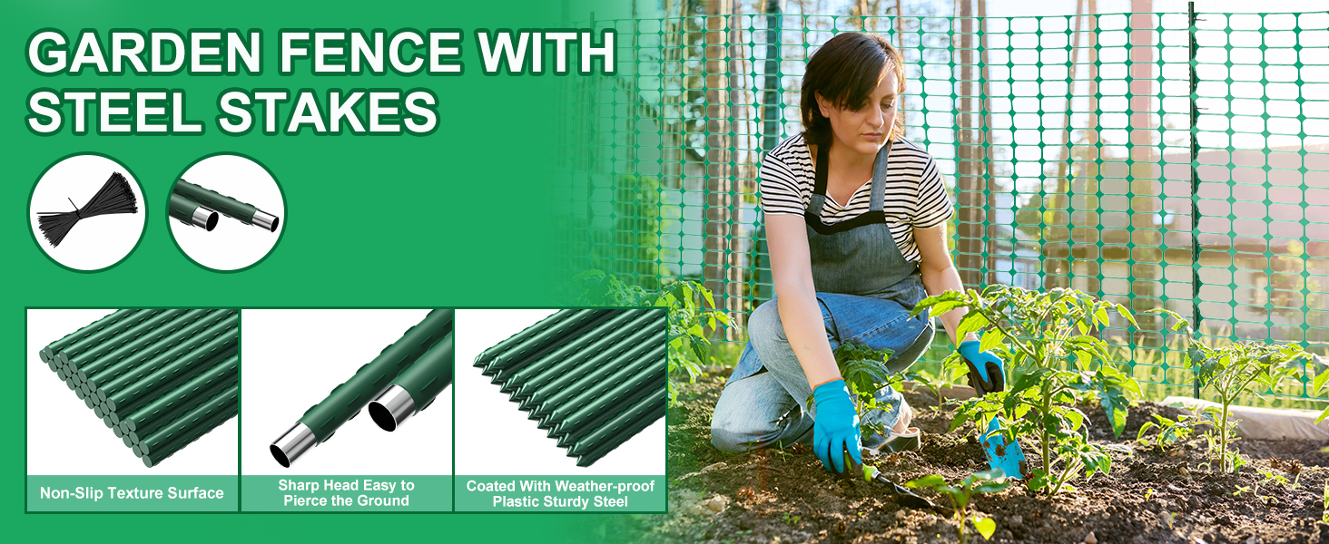 Safe and Reusable: Our garden fence is safe to use and will not cause harm to people or animals.The outer side of the steel stake is covered with plastic, which will not be hurt like steel or iron even if touched unintentionally. The color is bright and eye-catching, and will not fade after long-term use