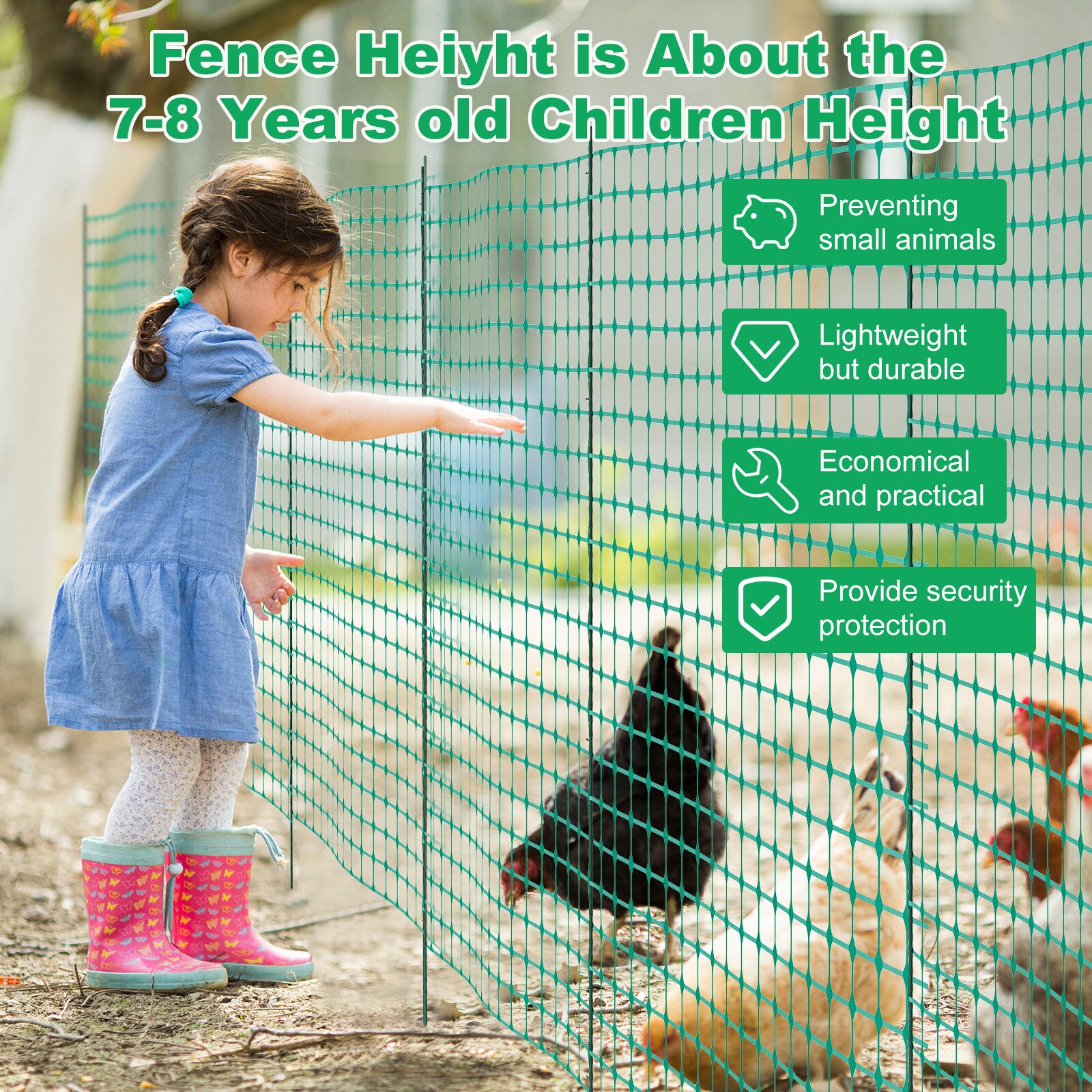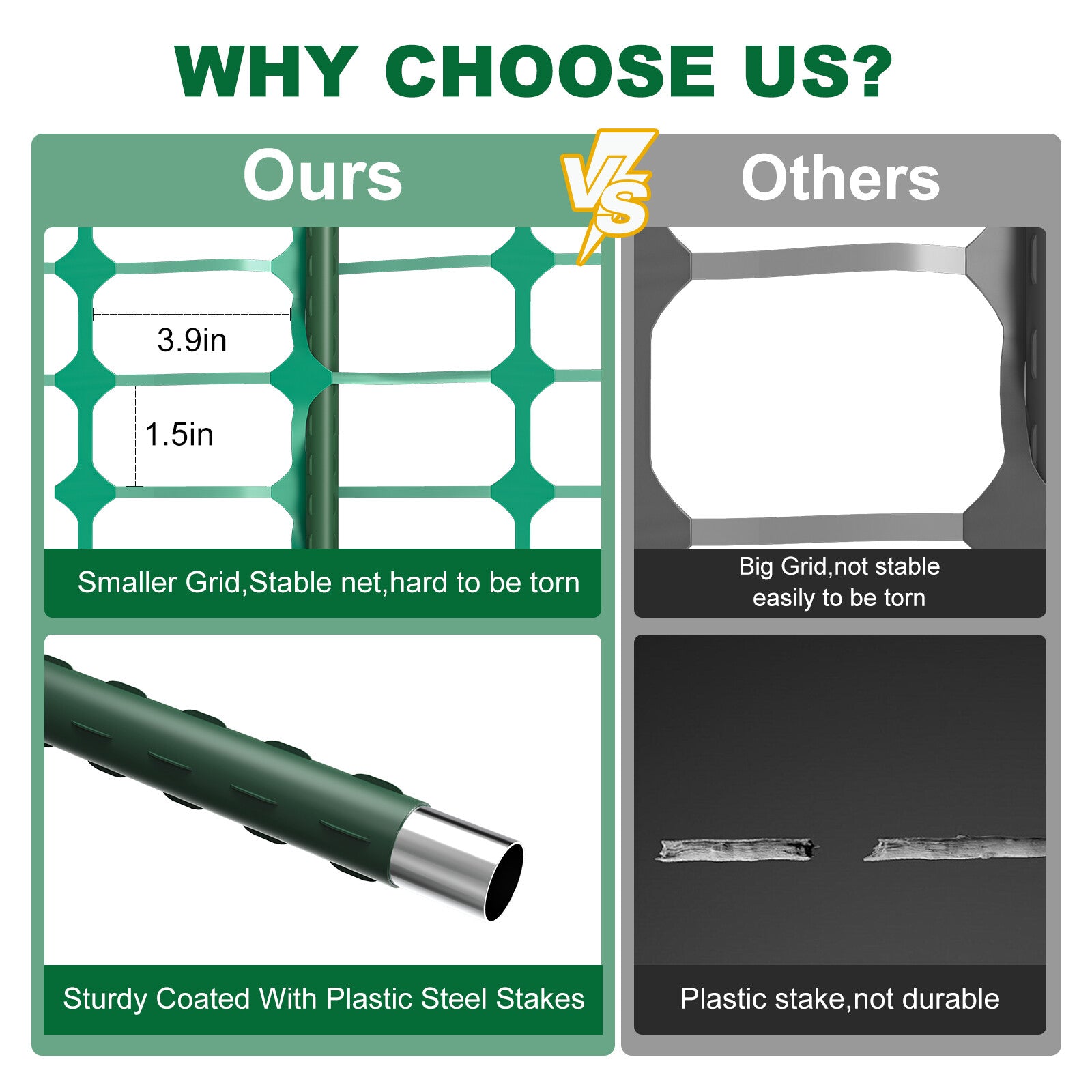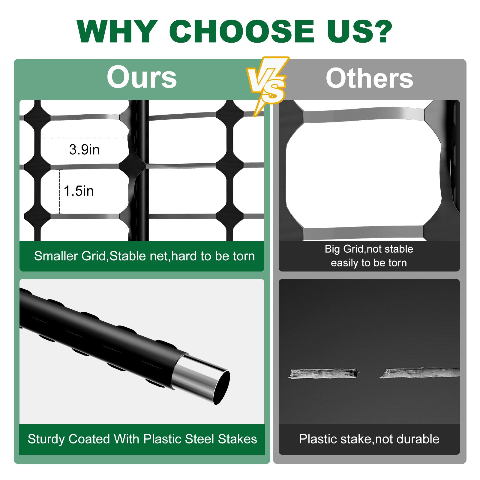 Corrosion Resistant, Extendable, Rot Resistant, Rust Resistant, Weatherproof, Durable, Dip-Treated, With Non-Slip Texture Surface, Anti-Rot, Easy to Install, Easy to Remove, Easy to Store, With Zip Ties, Smaller Grid, Stable Net, Hard to be Torn, With Sharp Head Easy to Pierce the Ground
