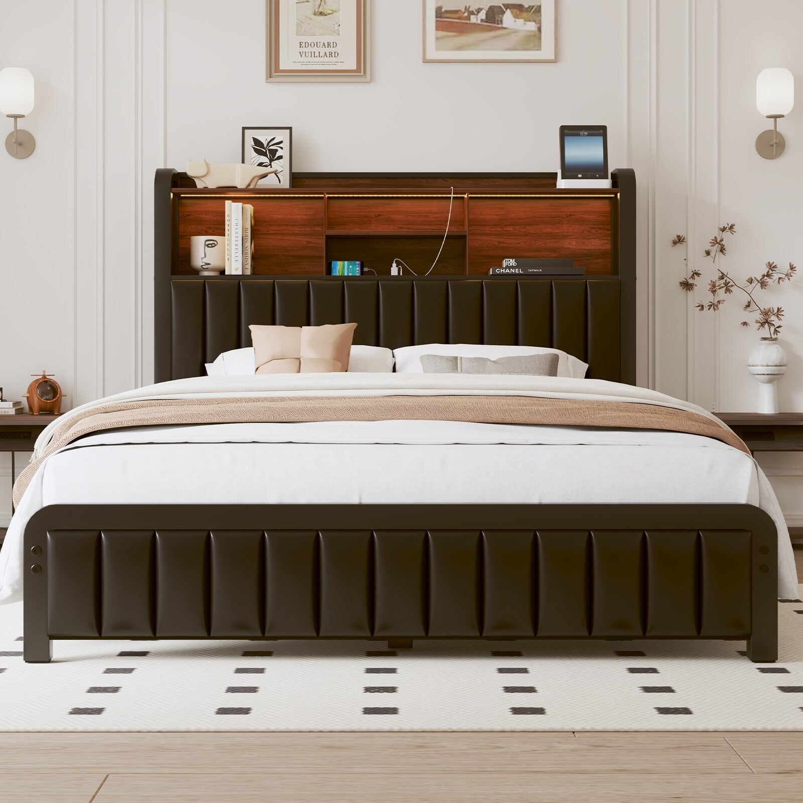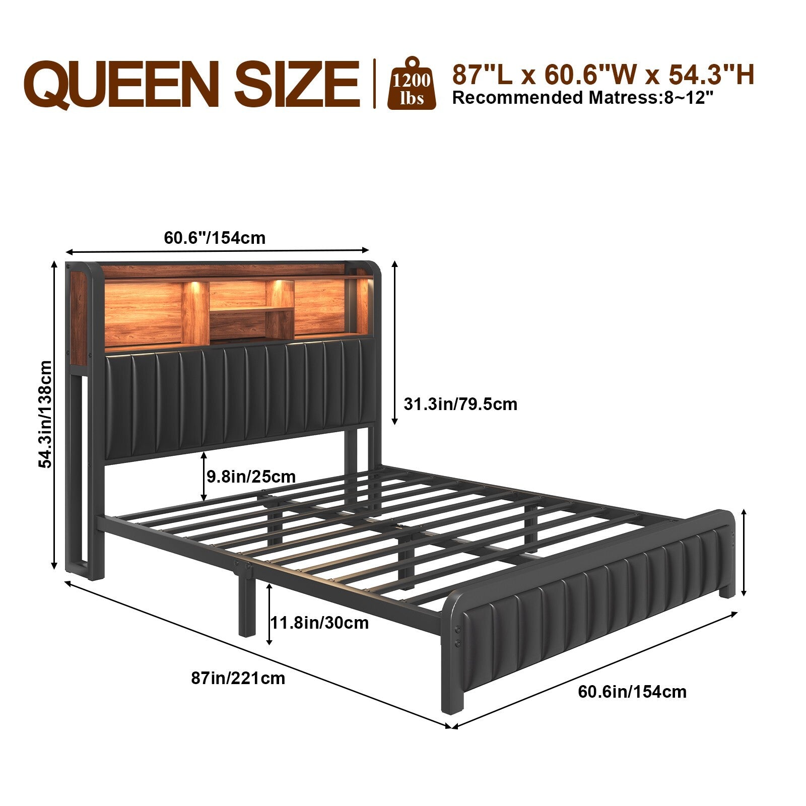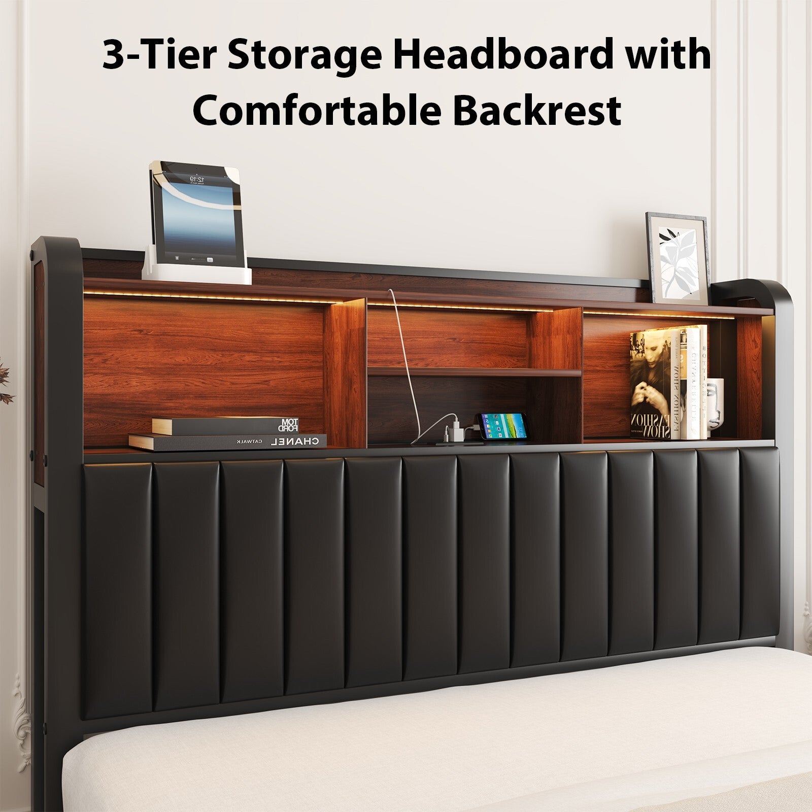 Queen Size LED Bed Frame with 3-Tier Storage Headboard&Charging Station