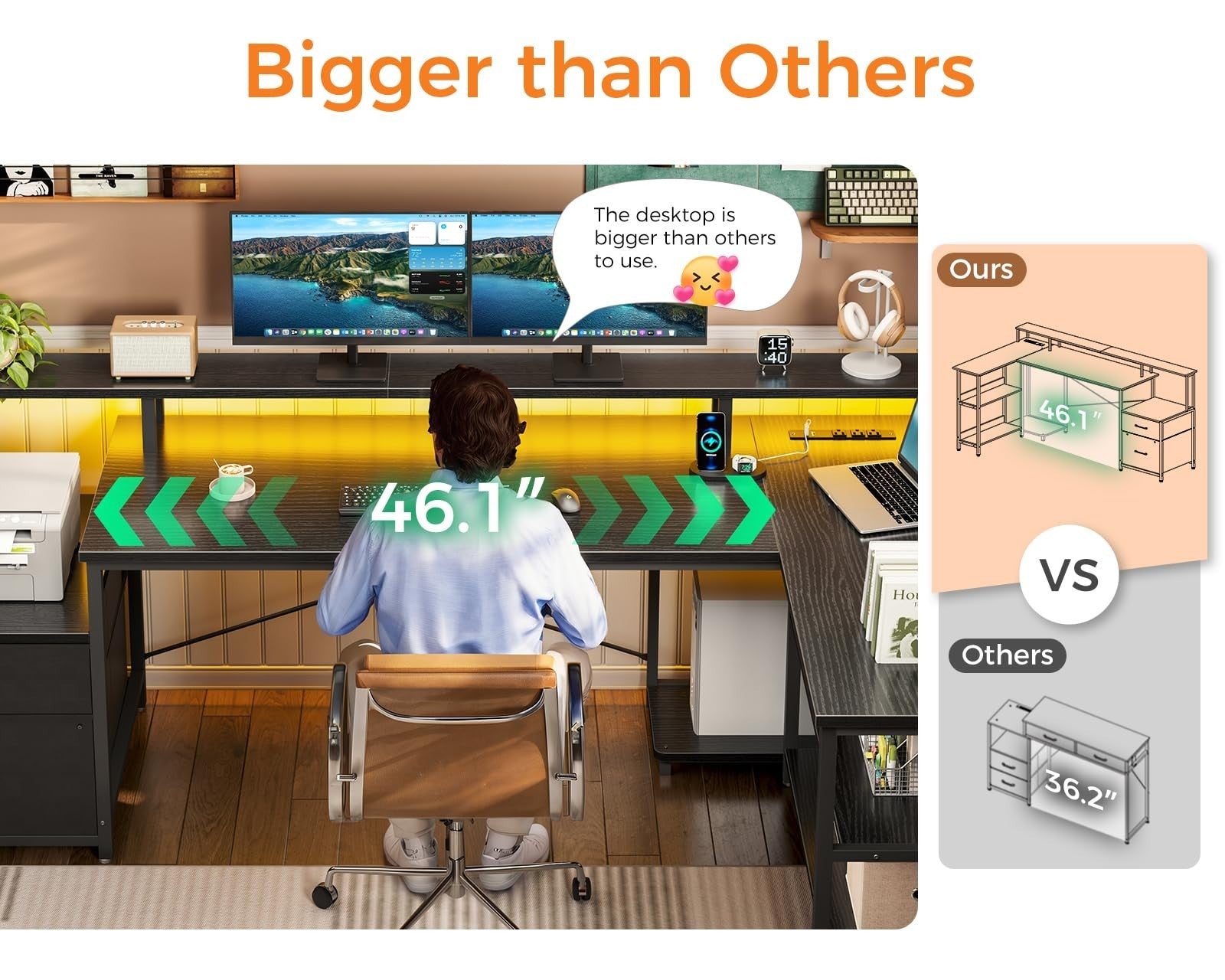 【Reversible L Shaped Desk】: The computer desk with a reversible design, which can be customized to suit your space perfectly. 【Convenient Charging & Monitor Stand】:The l shaped desk with power outlet features 3 standard plug outlets and 2 USB ports, providing convenient charging for your laptop, phone and gaming devices.